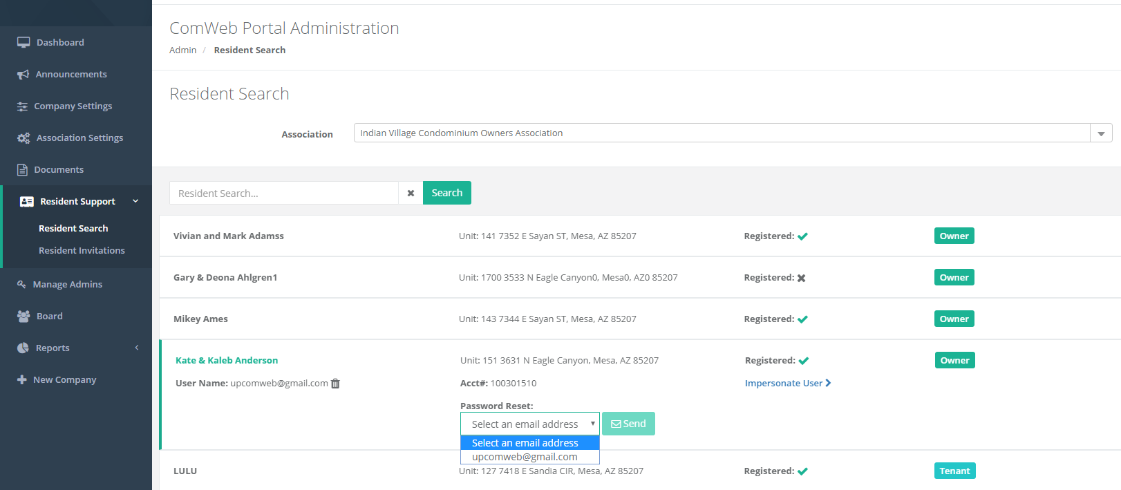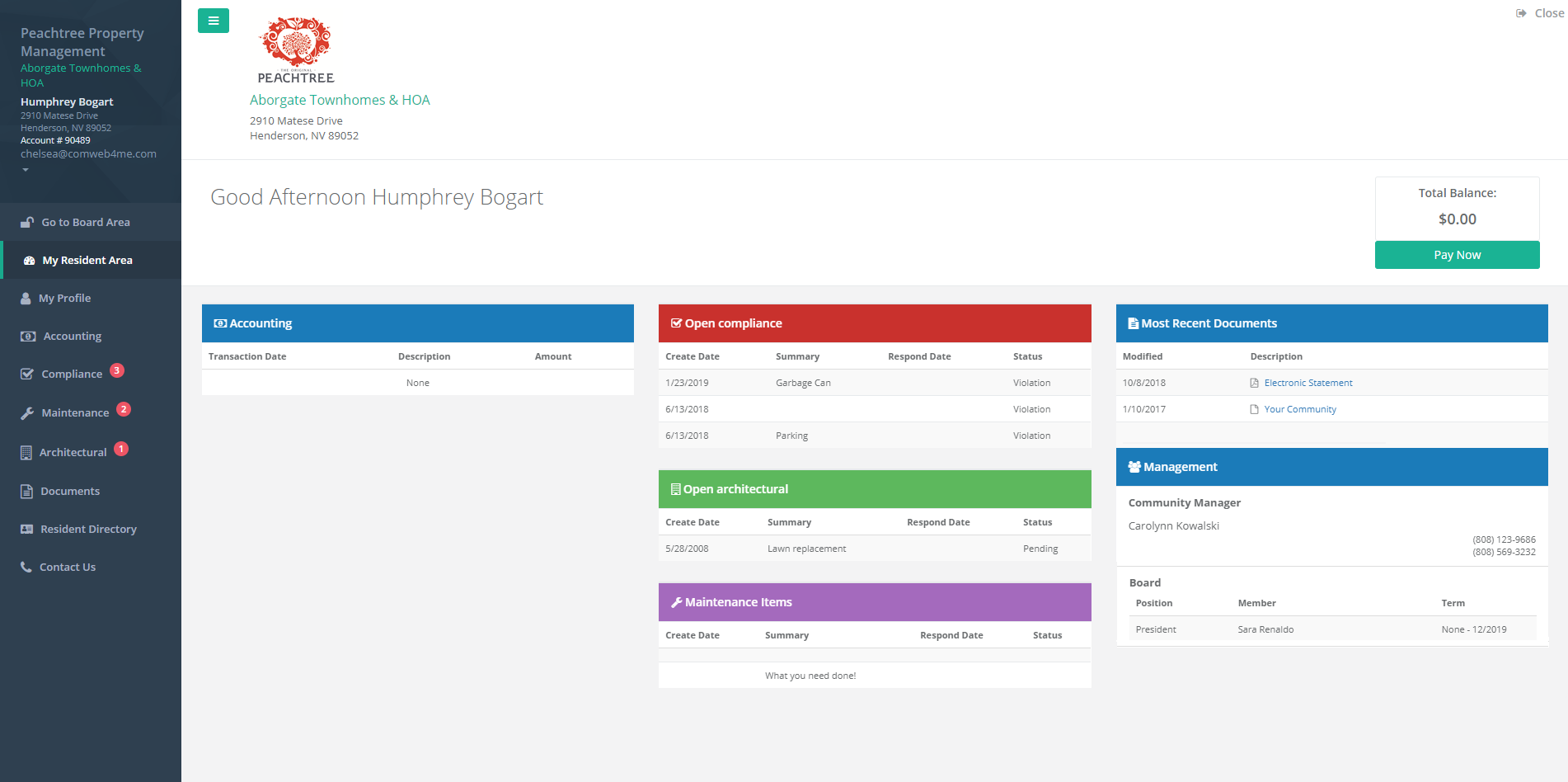 One of our key features with the portal is the ability to view residents’ profile exactly how they would! Impersonate any resident to see their accounting balance, compliance items, maintenance requests, and architectural submissions! This tool allows property managers insight to better serve your associations by making sure you and your residents are on the same page.