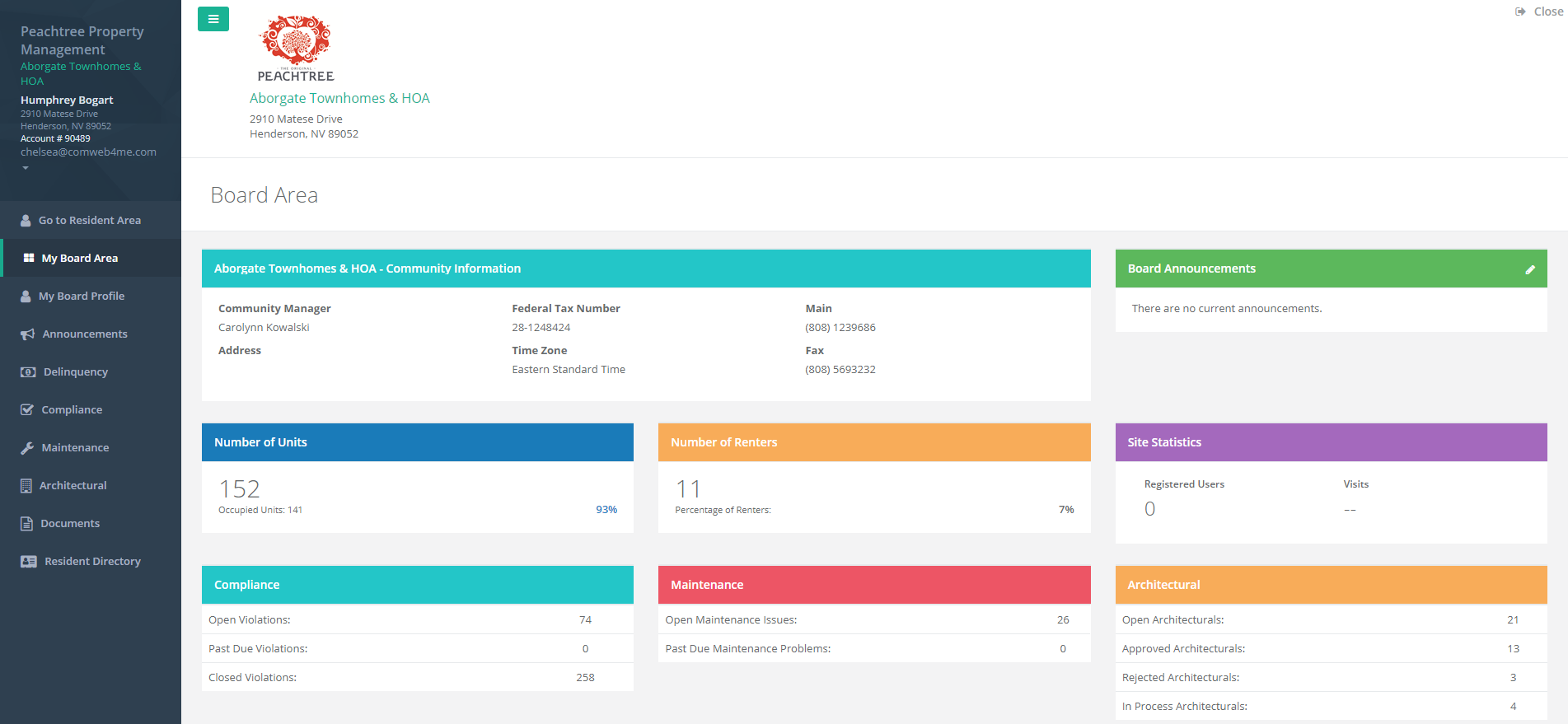 Our Board Dashboard allows board members to stay up to date on community operations without manager intervention. Managers can set display permissions to allow board members to view Delinquencies, Maintenance, Architectural and Compliance requests. Board members can also have access to edit announcements and view board-only documents.