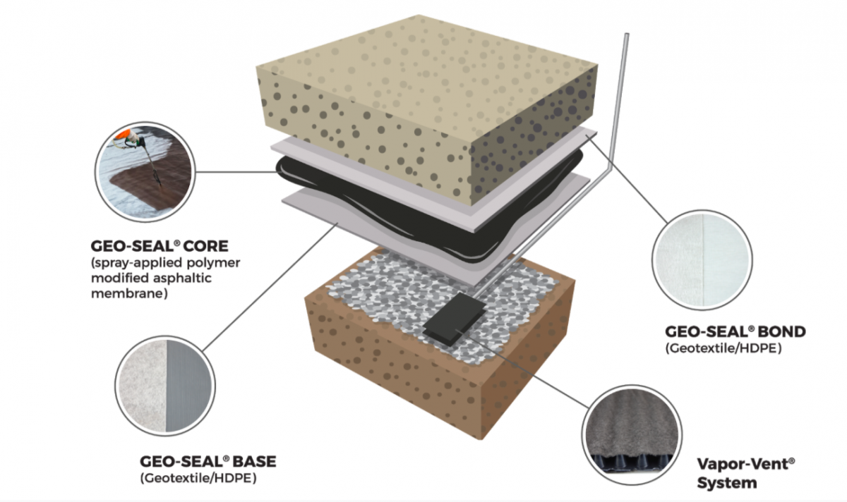 Geo-Seal® 100 is an industry-leading, patented sub-slab vapor intrusion barrier system that eliminates vapor intrusion for brownfields or any environmentally-impaired site. Similar to Geo-Seal® EV80 — but supercharged — Geo-Seal® 100 layers consist of Geo-Seal® BASE, Geo-Seal® CORE (60 mil) and Geo-Seal® BOND.