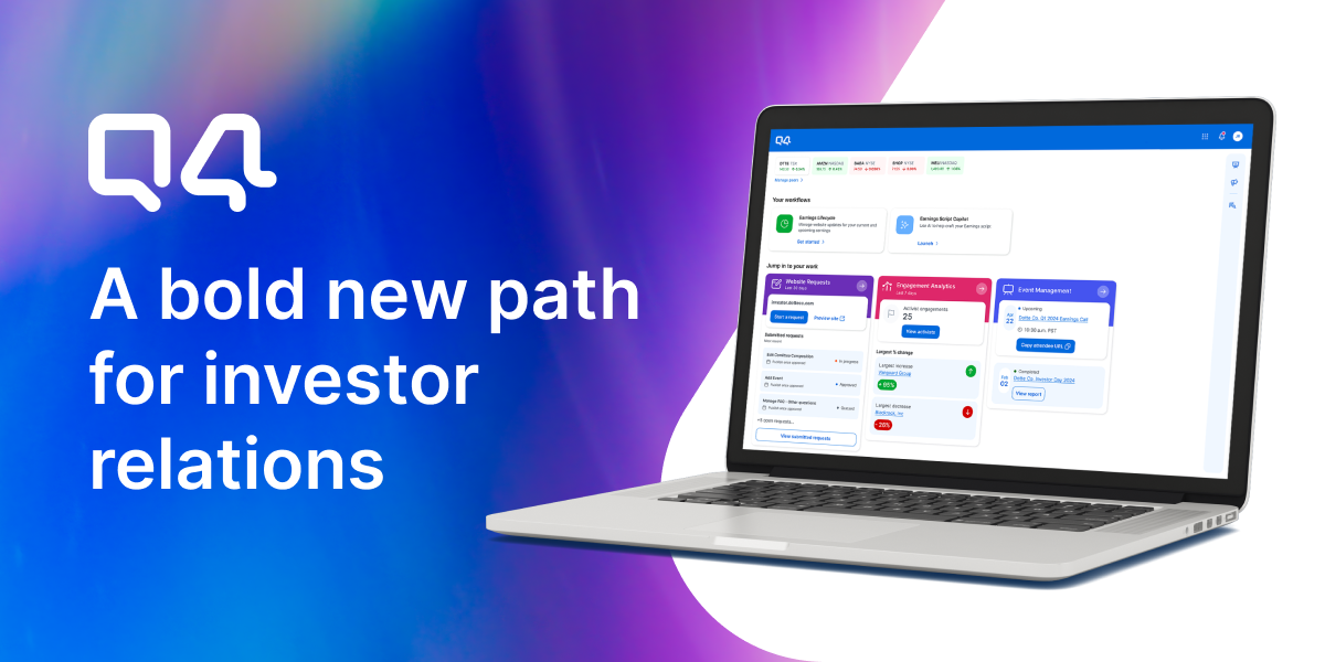 Q4 Inc. is the first IR Ops Platform with the world’s largest set of proprietary investor data, purpose-built to remove obstacles between public companies and their investors. Q4 gives investor relations leaders and their teams the tools to attract, manage, and understand investors — all in one place. The AI-enabled Q4 IR Ops Platform boasts a simple yet powerful IR website management system, frictionless events software, a robust analytics engine, a streamlined investor CRM, and shareholder intelligence with enhanced metrics to elevate investor targeting strategies. Q4 delivers the data, insights, and workflows that give IR teams the power to focus on what really matters: strategy, relationships, and driving premium valuations for their companies.