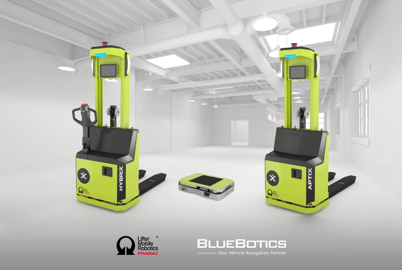 Pramac and BlueBotics have announced their partnership, which sees BlueBotics providing ANT navigation technology and fleet management software for Pramac’s new line of X-ACT mobile logistics robots.