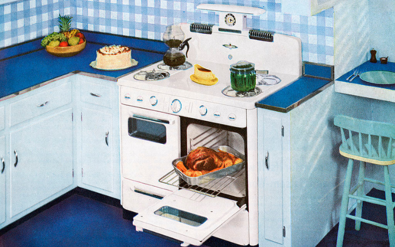 World War II influenced design with rationing and practicality, but post-war homes brought a warmer feel. Linoleum floors, electric ovens, and more cohesive cabinetry were introduced. The kitchen became slightly more welcoming but was still mostly separate from living areas.
