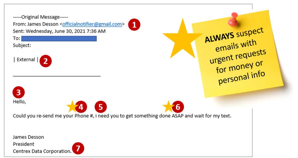Training is critical to educate our employees on cyber safety. A typical training exercise a company does with their employees are phishing simulations. Here’s a prime example of a real phishing email that we received here at centrexIT. The email looks like an urgent request for a phone number from James Desson, our president.