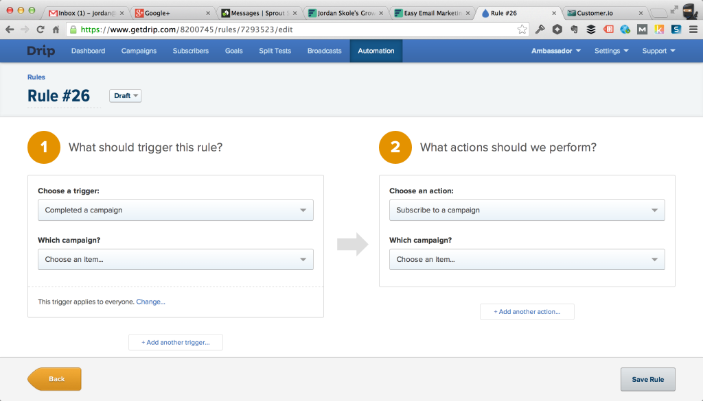 The next step is to nudge your users from the email crash course over to a longer newsletter campaign. Create your longer newsletter campaign. Navigate to the automation tab, and create a “New Automation Rule” and choose the most appropriate trigger and action.