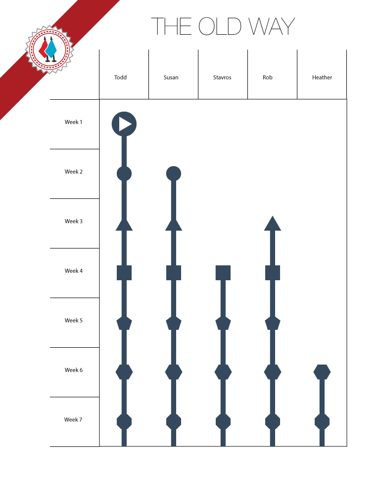 In the old model, since Todd was the only subscriber during the first week (Week 1), he was the only subscriber that received the starting email.