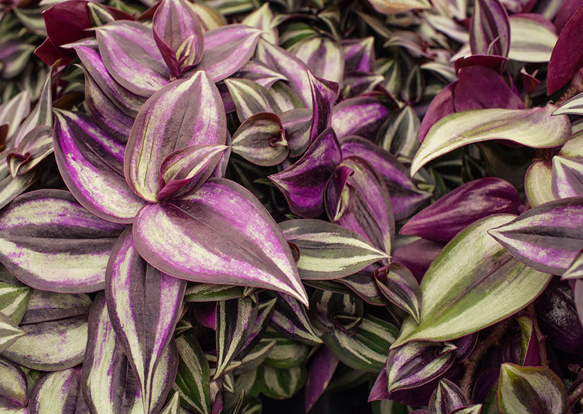 Zebrina (Tradescantia zebrina), also known as “inch plant” or “wandering jew,” is a versatile and easy care plant. Boasting variegated purple and green leaves with silvery stripes, it’s one of the most beautiful plants you’ll find, and we love it so much that we used Zebrina leaves to hand stamp the shape for our logo!