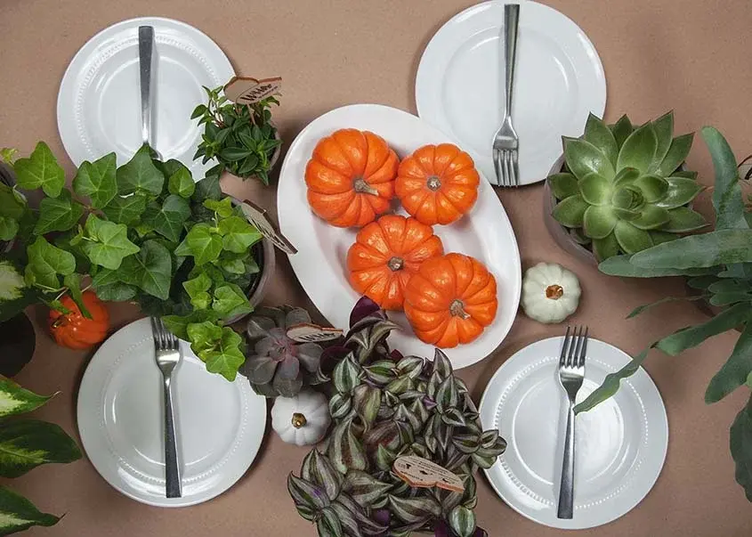 Decorating for your party is half the fun! Bring out a festive tablecloth and the cloth napkins for your oh-so-fancy soiree. While you’re at it, add a few plants to the mix. Amidst all the orange and brown, a pop of green will add a touch of life and energy to your fall decor. When the party’s over, plant it forward and give your centerpiece plants away to share the plant love with your best buds.