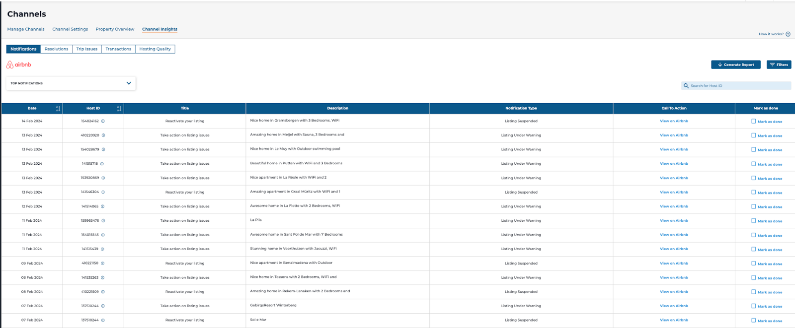 Under notifications we provide an overview of all Airbnb notifications hosts may get around the suspension status of their listings. They can either take action to prevent the listings from being suspended, or reactivate the listings after a suspension period has ended. The tool supports operational capabilities such as filters, reporting and a ‘mark as done’ functionality.