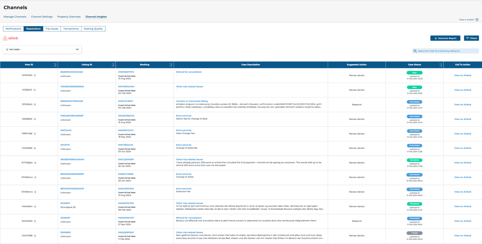 Under resolutions we are now showing all cases from Airbnb’s resolution center and we are connecting the resolution case to our listing and booking data. Moreover we are syncing all resolution case statuses, so the accommodation partner will be able to action and filter those cases that need the most urgent attention.