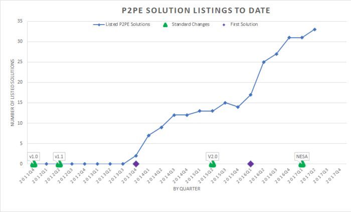 Most people don’t appreciate how big a job it is to build a P2PE solution. It isn’t just about the initial and ongoing investment, there can be significant challenges. P2PE v1 lacked flexibility. P2PE v2 improved on that significantly. The situation is evolving and will continue to do so. While not only the P2PE standard evolves, the market itself is transforming producing a mixture of solutions. All stakeholders in this space need to understand that and learn how to deal with these changes. To illustrate this, the following charts show the current and historical state of P2PE approved solutions including the gaps between changes to the P2PE standard and emergence of the first solutions. Clearly, launching a P2PE solution is easily a one to two-year project.