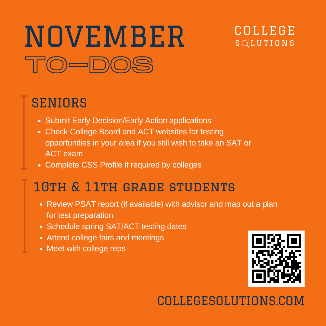 November is a busy month for the college admissions process. If you’re a senior, junior, or sophomore, below are the items you should work through this month. Save this graphic to your phone and refer back to it throughout the month.