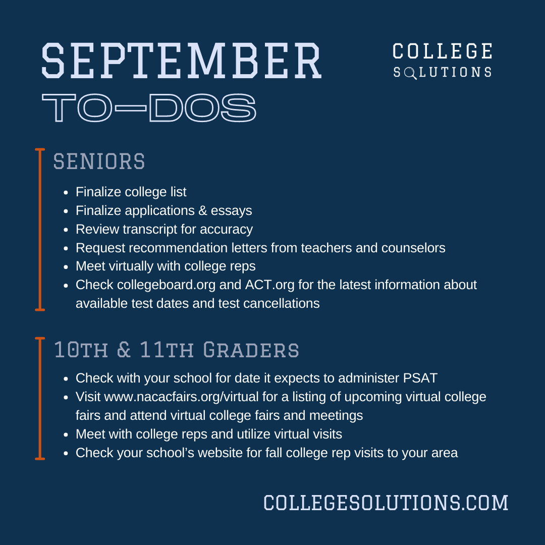 Back to school time is a busy period for high school students. Every month, College Solutions provides an overview of some of the key college planning and admissions activities for students.