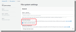 Starting now, any new AWS Elastic File Service (EFS) file system are automatically backup with recommended settings (daily backups with a retention of 35 days) during the creation process.
