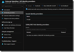 From there access the All Identity Providers to configure Google, Facebook or any SAML/WS-Fed identity providers