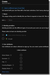 When creating a new user flow, you define the identity providers available for this flow (see above), which user attributes you need (if not available from the identity provider, end-user will be asked to fill it)