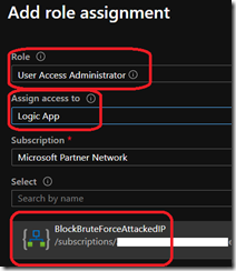 Now you need to grant the BlockBruteForceAttackedIP Logic App either User Access Administrator or Owner for the subscription(s), group management or resource group to scope your usage (scope of your Azure Security Center protection)
