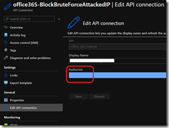 Then you need to grant the Office 365 API called office365-BlockBruteForceAttackedIP by accessing the Edit API connection blade by hitting the blue button