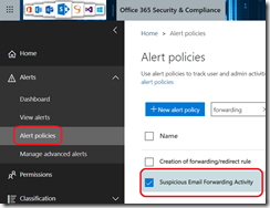 Finally, Exchange administrator can be alerted on suspicious email forwarding using the Alert policies; you may already know that you can be alerted when an automatic forwarding is set (Alert for automatic forwarding) but this one will let you keep the automatic forwarding capability available for your end user and notify you when suspicious forwarding is set.