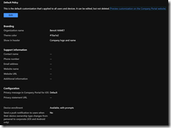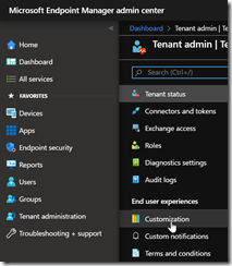 To do so,, logon to your Endpoint Configuration Manager portal (https://devicemanagement.microsoft.com/ or the new URL https://endpoint.microsoft.com/) reach the Tenant AdministrationCustomization blade under the End User experience section