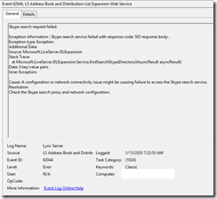 If you lookup your Lync/Skype for Business front-end server you will probably find an error with the event ID Event ID 62044.