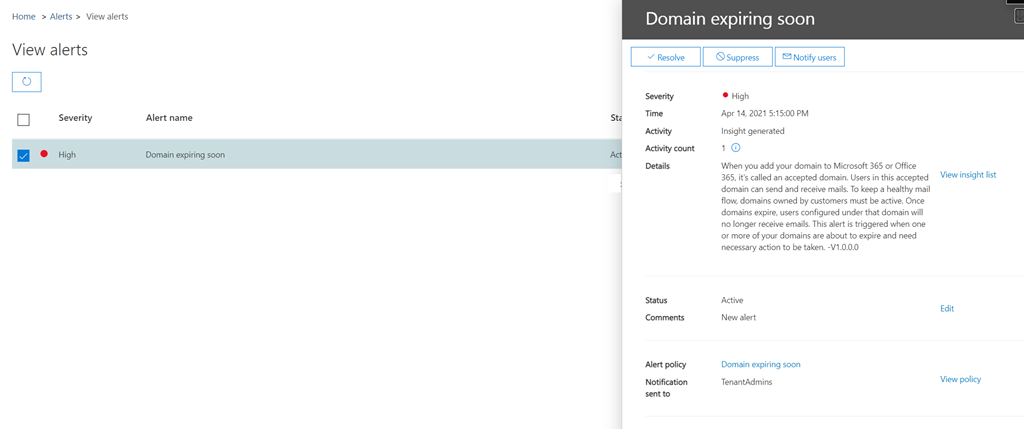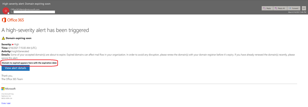 This feature, called Expiring Domain Insight, will notify you with an high-severity alert, sent to the tenant administrators, letting you know every 90, 60 and 30 days when a domain is expiring (below a sample of the alert)