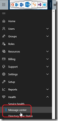 To start using this new capability, logon to your Office 365 administration portal (https://admin.microsoft.com/) and access the Message Center blade under the Health section.