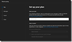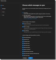 This will then launch the integration configuration to define the Planner plan (you can create a new one too which then will open the Planner site), the tasks buckets (which can help filter the messages based on their category), filter the messages you want to sync (by product and categories) and finally if you want to import the past messages (up to the last 28 days)