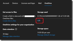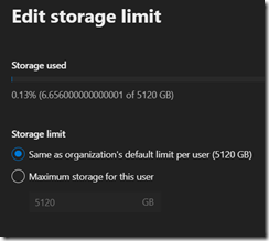 Then you will see details about the OneDrive space and under the Storage used you will be able to Edit the assign limit for this user. You can then define a new limit in Gb