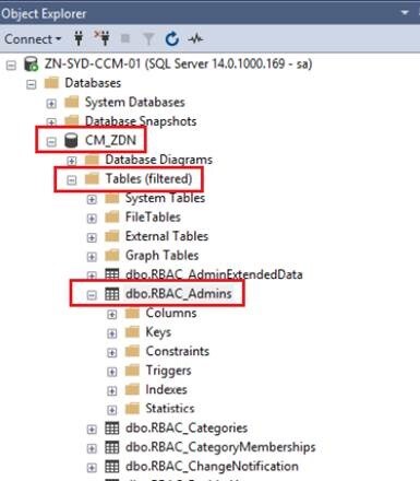 - Go to your CM_<SiteCode> database, then click on Tables then filter for: RBAC_Admins.