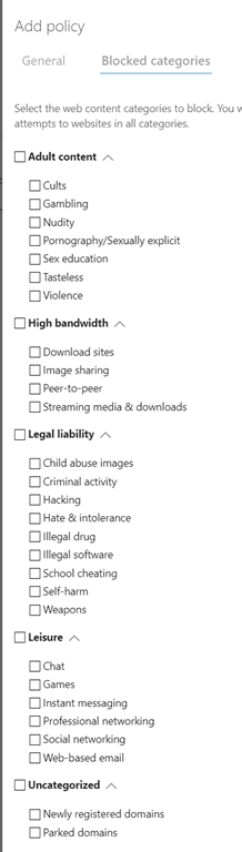 There you can create a new web content filtering policy, when creating the policy you have to select either the full category or part of it to block the access to website identified as part of this category