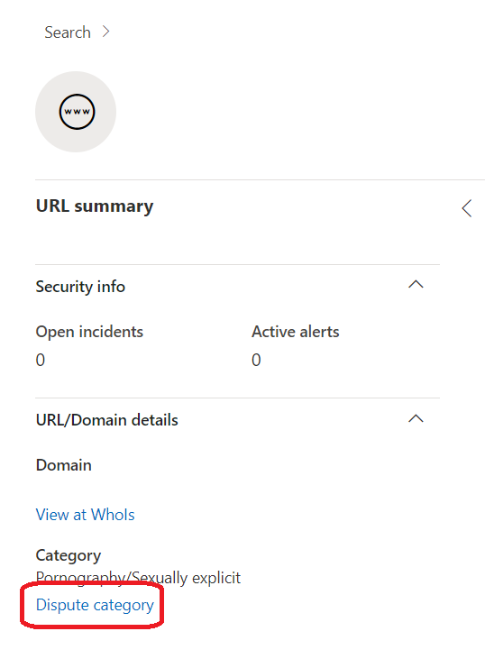 Then select the URL option for the search and enter the domain you want to dispute the categorization, in the result (if the domain has been already identified) you can hit the Dispute category