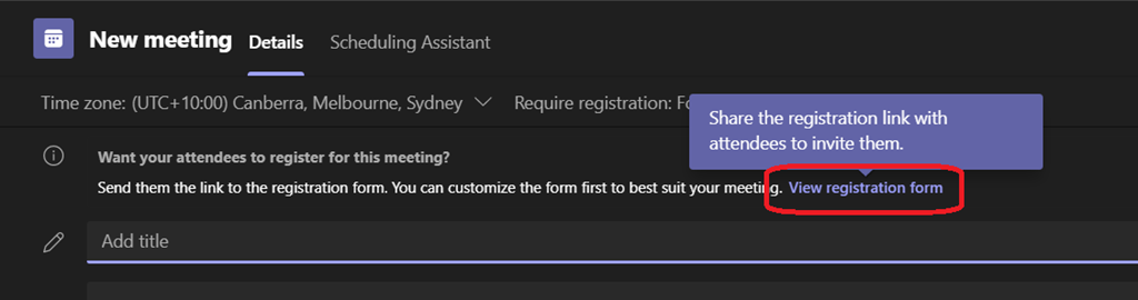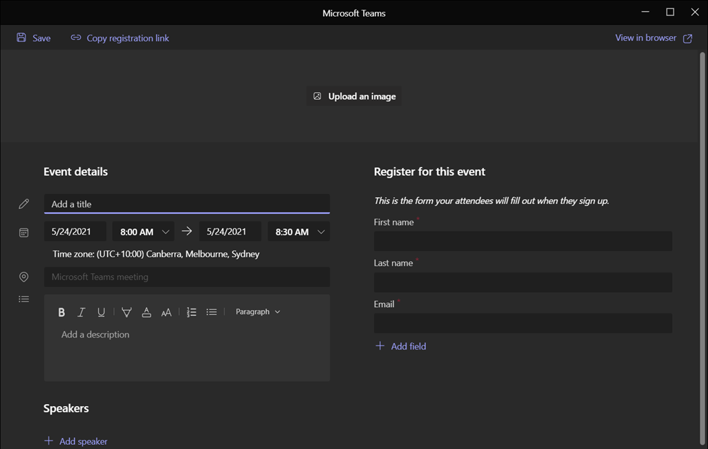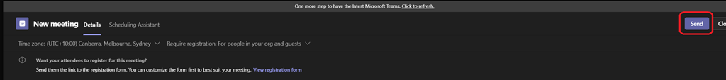 Once all done, click the Save button to have the registration page setup; then close the registration page and hit the Send button in Teams client