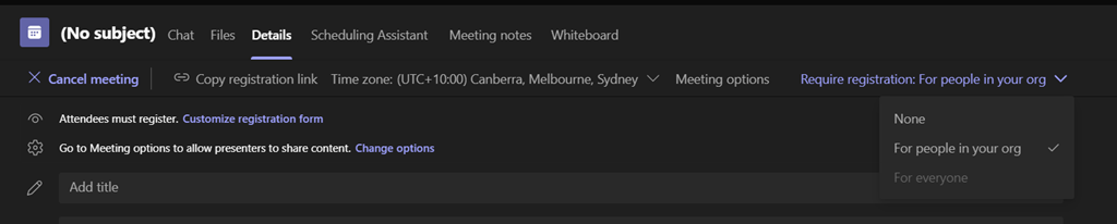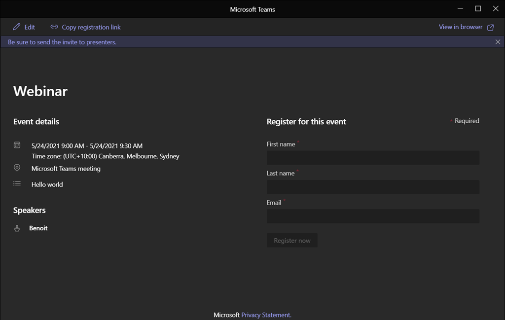 Once the webinar has been sent, you can adjust the options by opening the webinar event in Teams and get the registration link to share