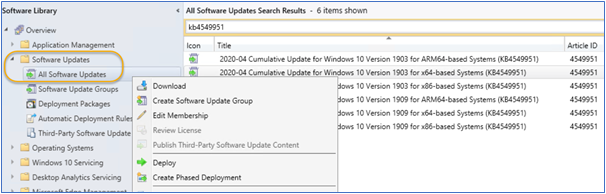 - Search for and right click on the Update you’d like to deploy and, select Create Phased Deployment