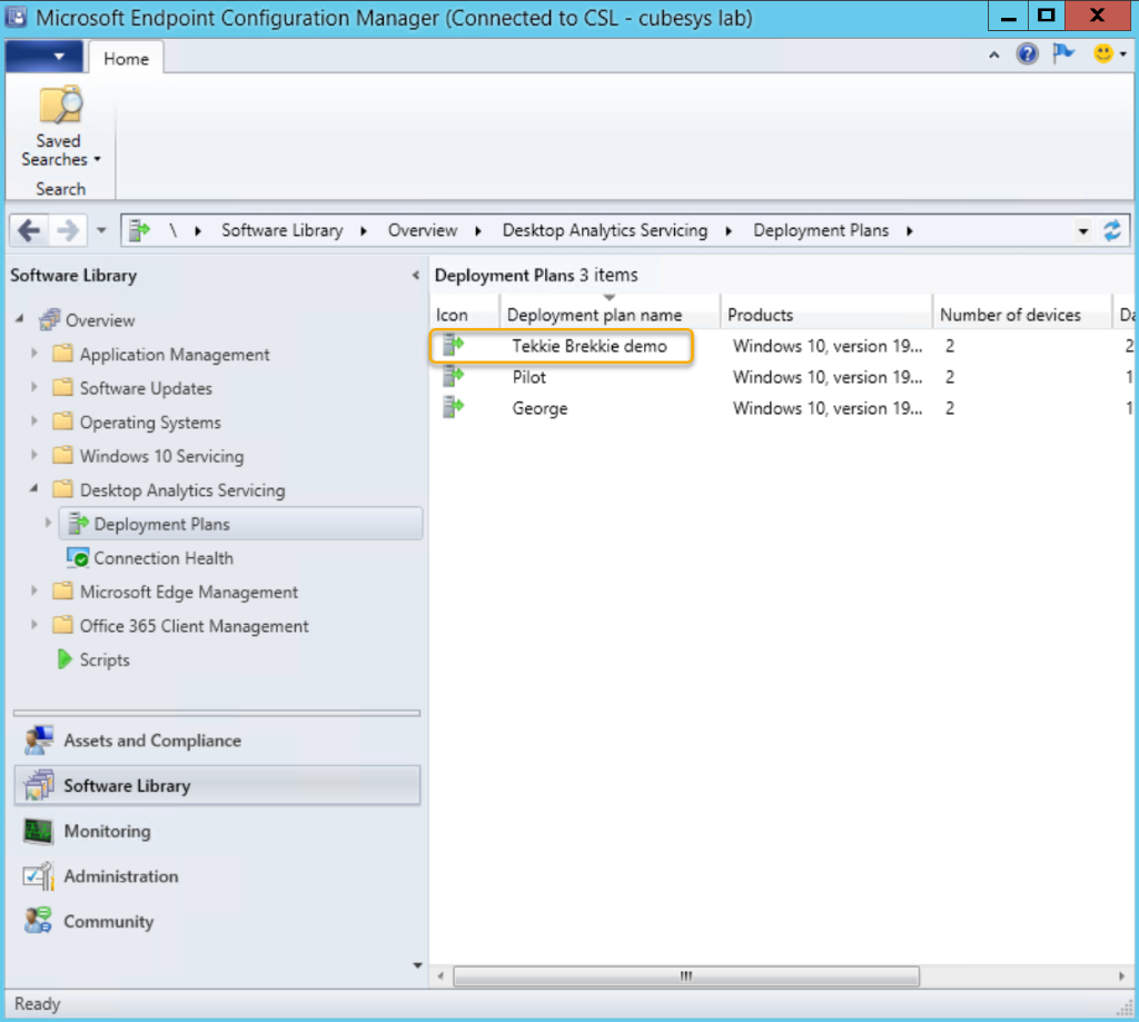When you create a Deployment Plan in MEM DA, it will appear in the Desktop Analytics Servicing folder in your MEM CM under the Software Library node: