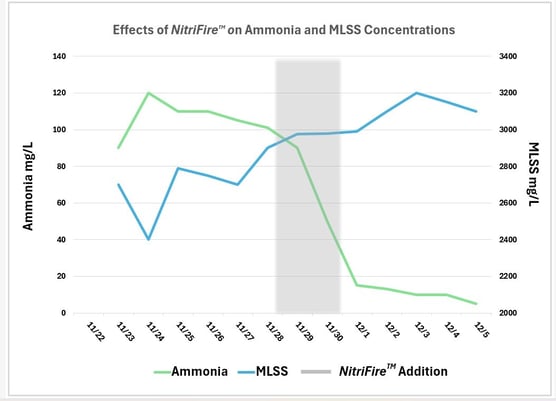 As demonstrated in the accompanying graph, the increasing of aeration basin MLSS concentration was gradually reducing the effluent ammonia levels. However, adding EBS NitriFire significantly accelerated the reduction in ammonia levels and return of the system to compliance. Ammonia removal reached over 90% within 72 hours (about 3 days), following the product addition.