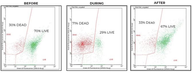 Recently, one of our clients experienced a significant black liquor spill at their facility, resulting in a high Biochemical Oxygen Demand (BOD) in the final effluent. We suspected that the spill caused a substantial reduction in the live bacterial population due to the rapid environmental changes occurring in the treatment basin. Our team arrived on-site the following day to begin assessments. Using flow cytometry, we detected a 41% reduction in the live bacterial population compared to the usual levels at this plant. In response, we implemented a recovery strategy that included adjusting pH levels, enhancing biological activity through bioaugmentation, and adding nutrients. These measures proved effective, and the bacterial levels subsequently returned to normal at a 67% live population.