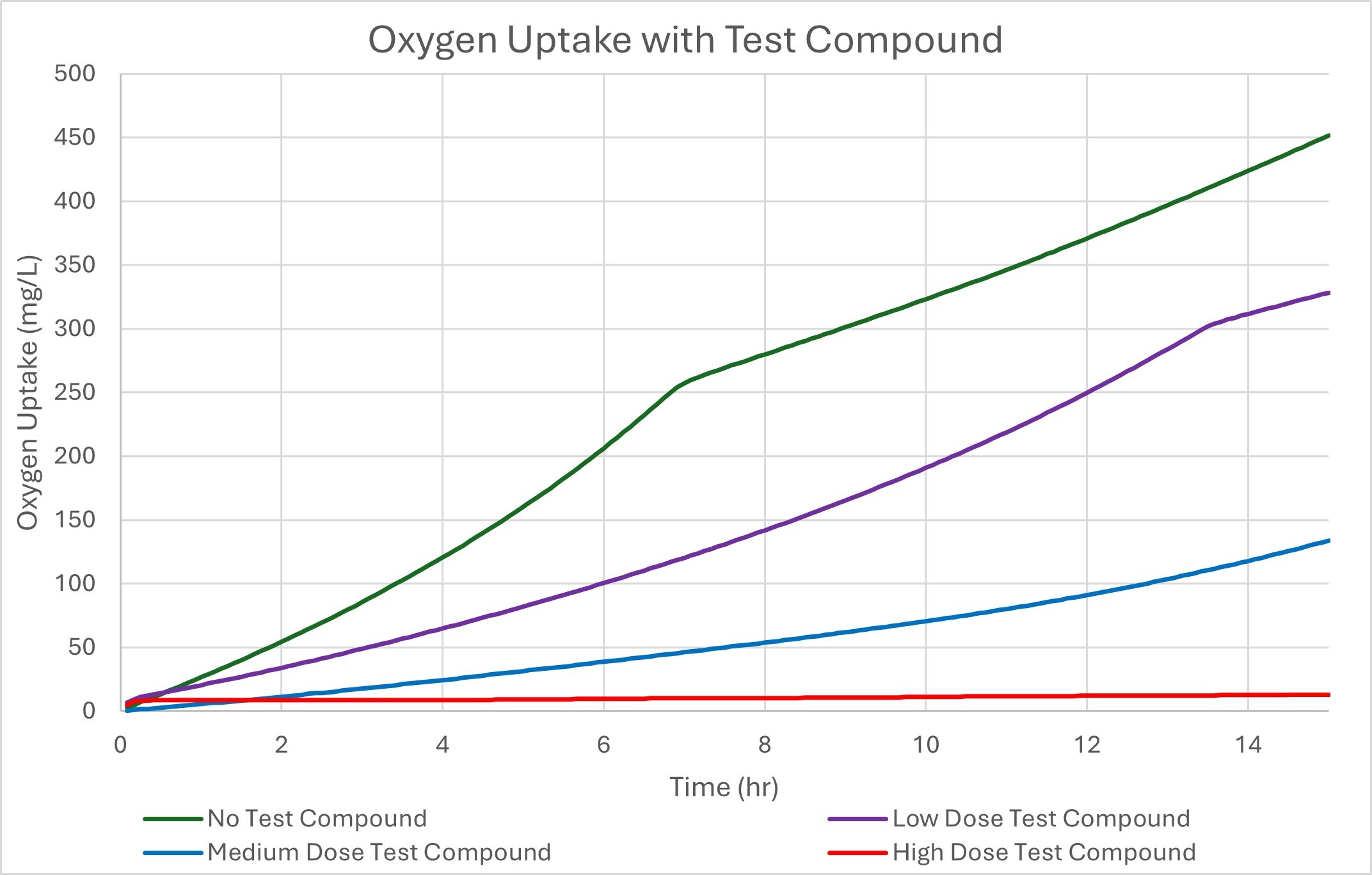 A control bottle, containing only biomass and influent without biocide, was used to establish baseline activity. All three doses of biocide reduced the oxygen uptake of the biomass compared to the control. As expected, the higher the biocide dose, the more reduction in microbial activity that was measured.