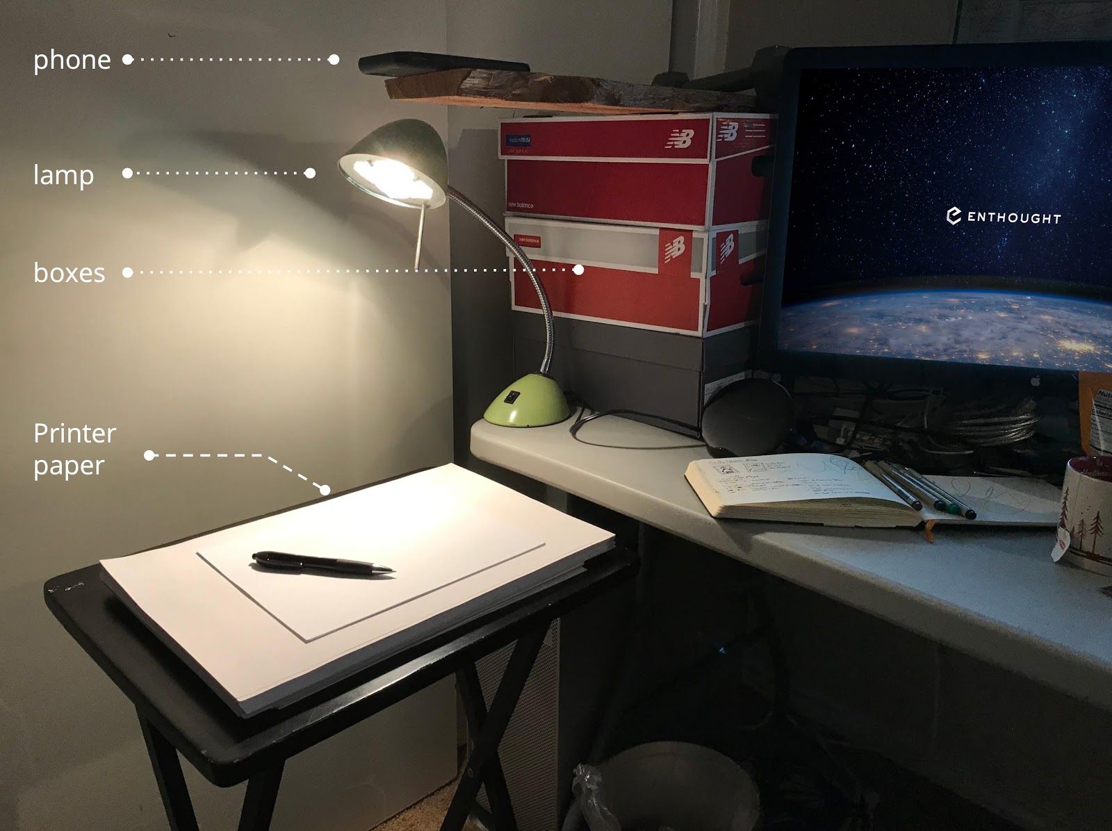 An effective, ‘at-home’ whiteboard solution needn’t be complex. A simple set-up is all, using a phone, held above a piece of paper (use books, boxes, or a stand to adjust the height of the phone). A lamp ensures the paper is lit sufficiently to be seen on a screen.