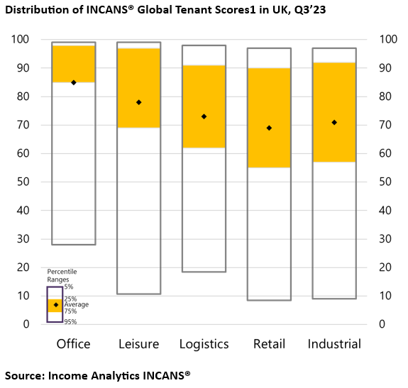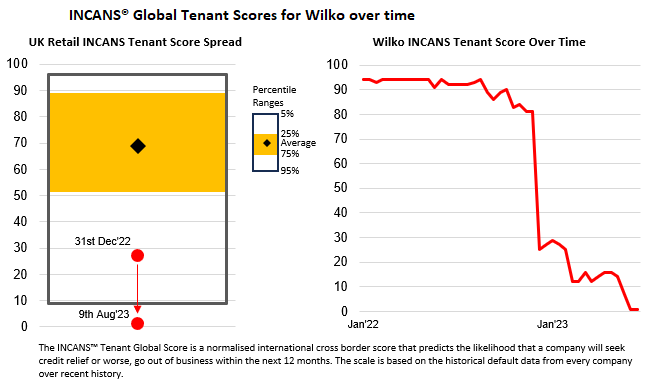 As a case study, the chart includes analysis for the top 1,300 Western European retail occupiers by revenue. These will be the typical retail occupiers of institutional grade retail assets. There is a wide dispersion of the INCANS Tenant Global Scores (from 1 to 100). The scores predict the likelihood that a company will week credit relief or fail, 1 being the worst.