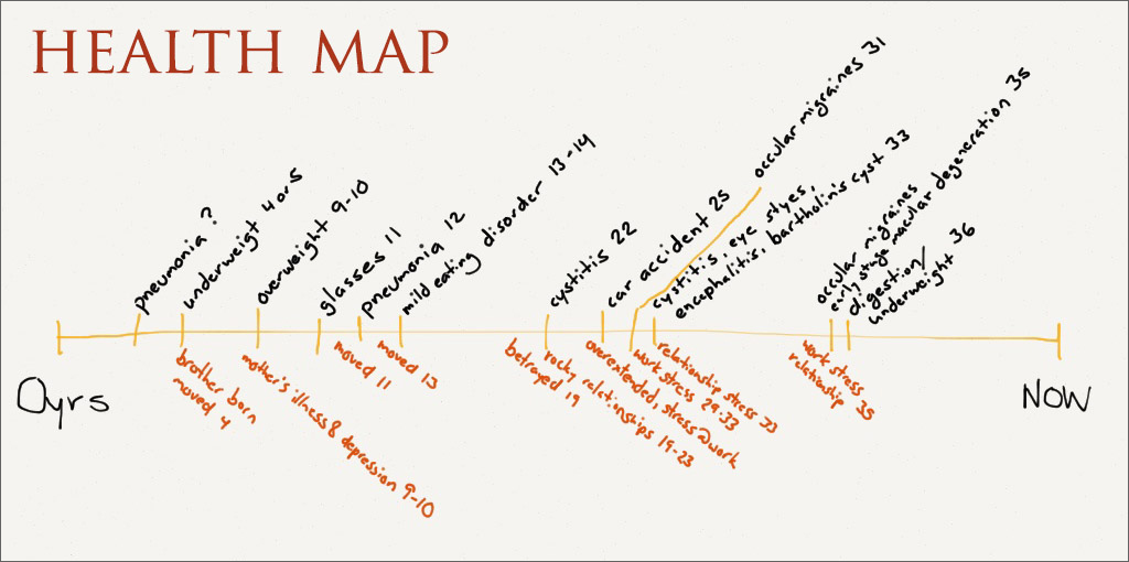 So what does that mean for our life experiences and how they affect our health? Creating your own personal health map helps you identify triggers that could potentially negatively impact your health as well as see the positive factors that make you feel vibrant and healthy! Below is an exercise that will give you an opportunity to record vital information about your lifetime experiences and your health history on a timeline.