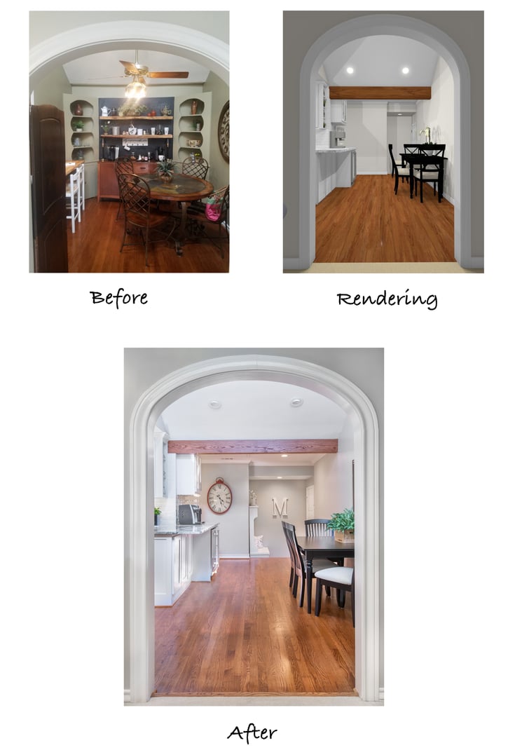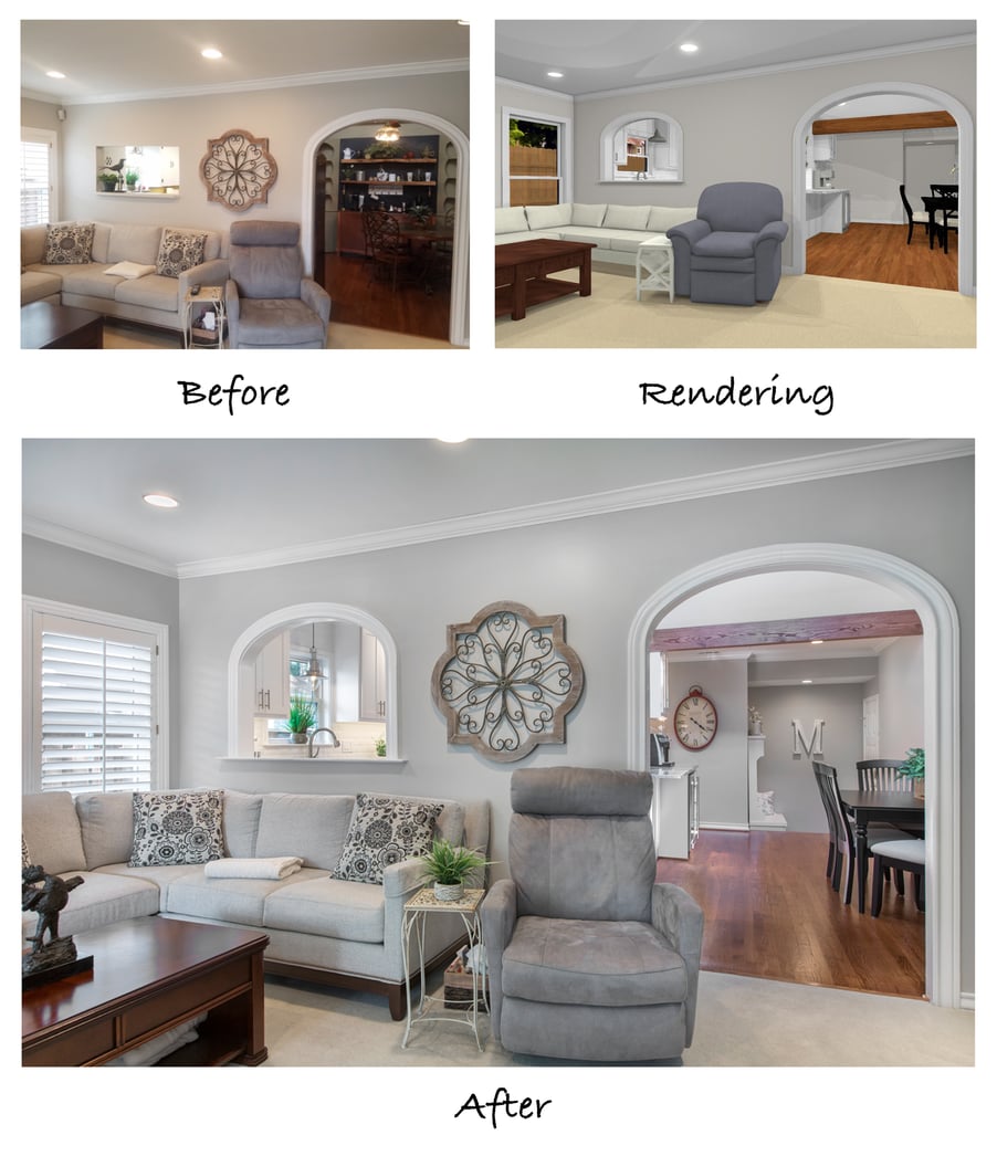 Our design team met with the clients in their home to discuss the issues and what options there were to correct them. You can see in the before and after floor plans that one of the biggest structural changes was removing the back wall in the dining area, creating a new walkway to the master bedroom. By creating a “straight shot” from the front door to the back of the house, we were able to use more square footage for the living spaces, such as the dining room that is now much more spacious.