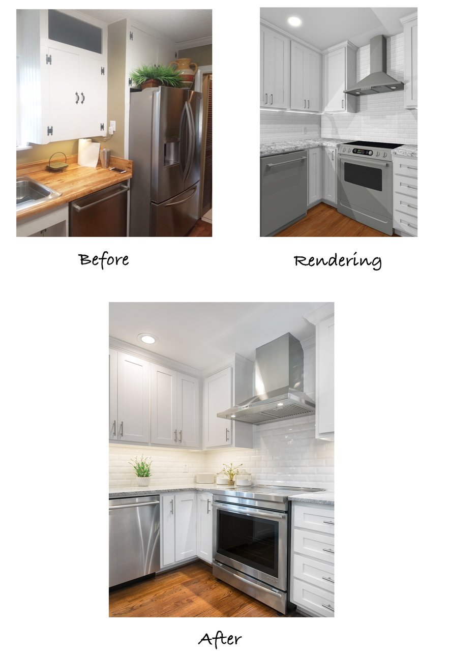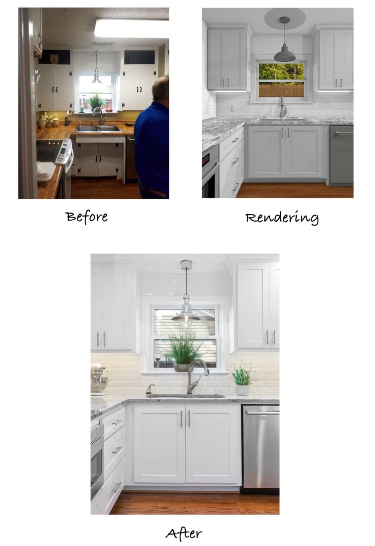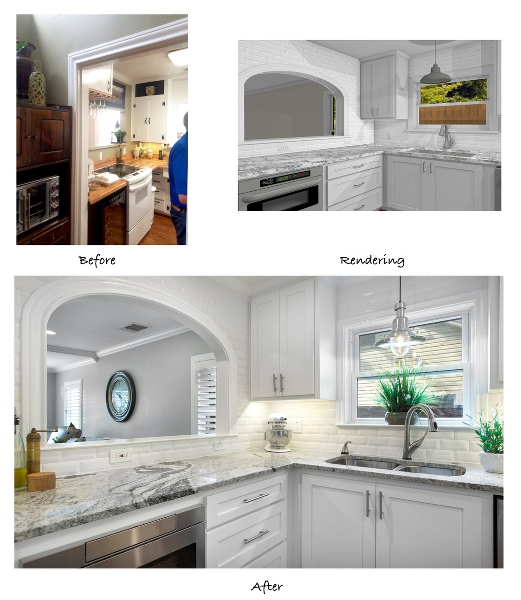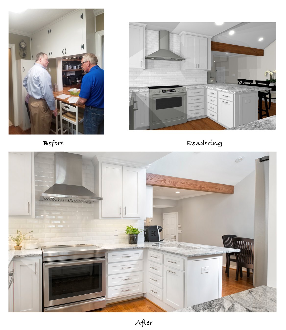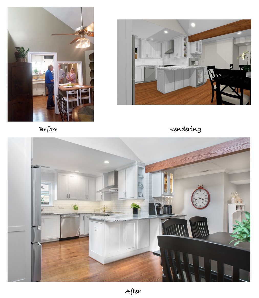 In the before picture, our owner, Mike Medford Sr, chats with the clients about the structural changes that will take place in their home. You can see that the dividing wall between the kitchen and dining area was removed, really enlarging and brightening the space. The breakfast bar previously sat within a small pass-through window just beside the kitchen doorway, creating an awkward, choppy wall and a cramped eating area. The remodeled version is much more spacious, with ample counter space for family and guests to sit without feeling crowded.