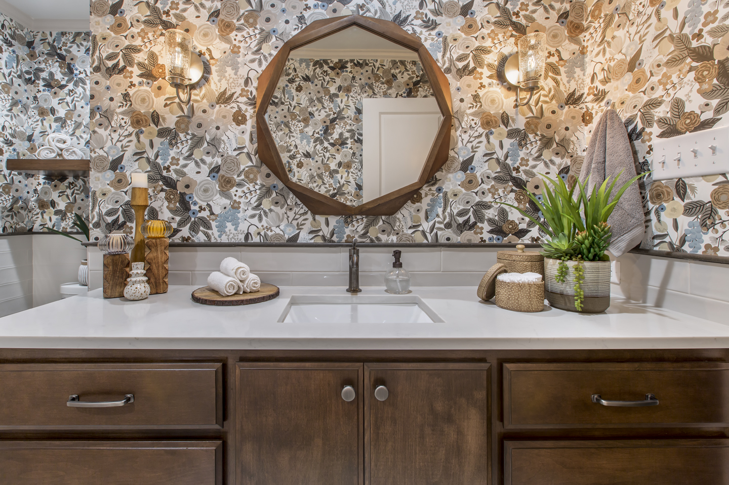 “This was such a fun project because the client wanted a look with some different and fun looks, even towards the trendy-looks side, which we do not do all that often. Most people are not brave enough or design-savvy enough to do this sort of thing and know that they will love it for a long time. From the wallpaper, to the fun accent mirror used, to the accessories that topped it off – it all came together wonderfully!