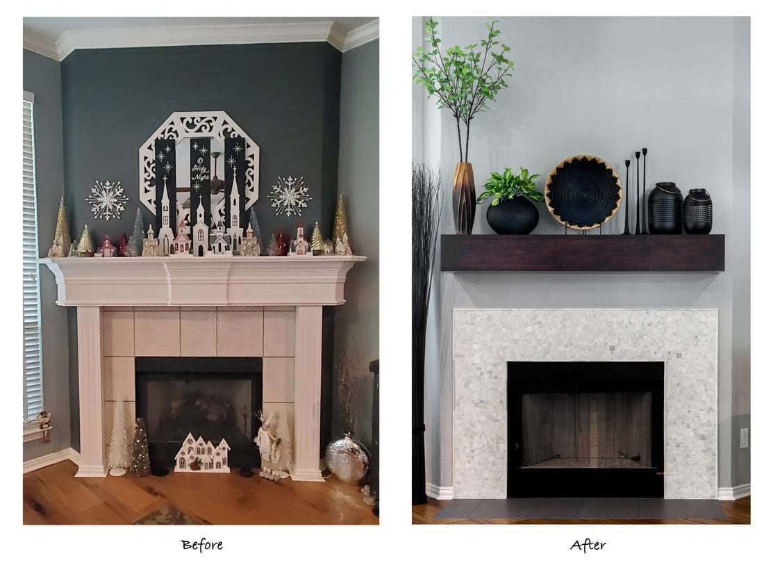 You’ll also notice that the fireplace in the living room matches the kitchen. Our team removed the dated façade and created an updated look with the same tile and wood elements from the kitchen, providing consistency to tie the spaces together.