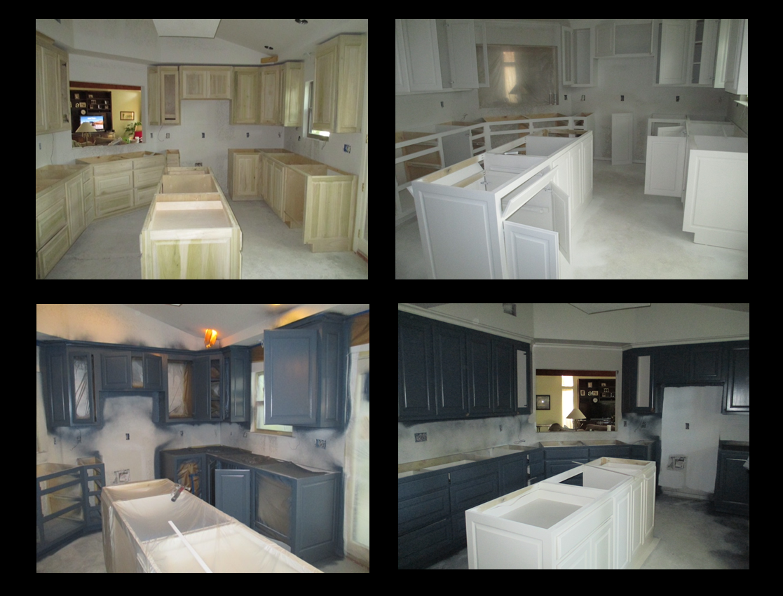 Next was the installation and finishing out of the cabinets. The new cabinets went all the way to the ceiling, providing more storage space and making the kitchen look larger. The clients chose a dark, blue-gray as the cabinet color, which really made a bold statement in their new kitchen. Some stylish details were also added, such as dainty glass-front cabinets on either side of the fridge and LED under cabinet lighting to showcase their custom-made tile backsplash.