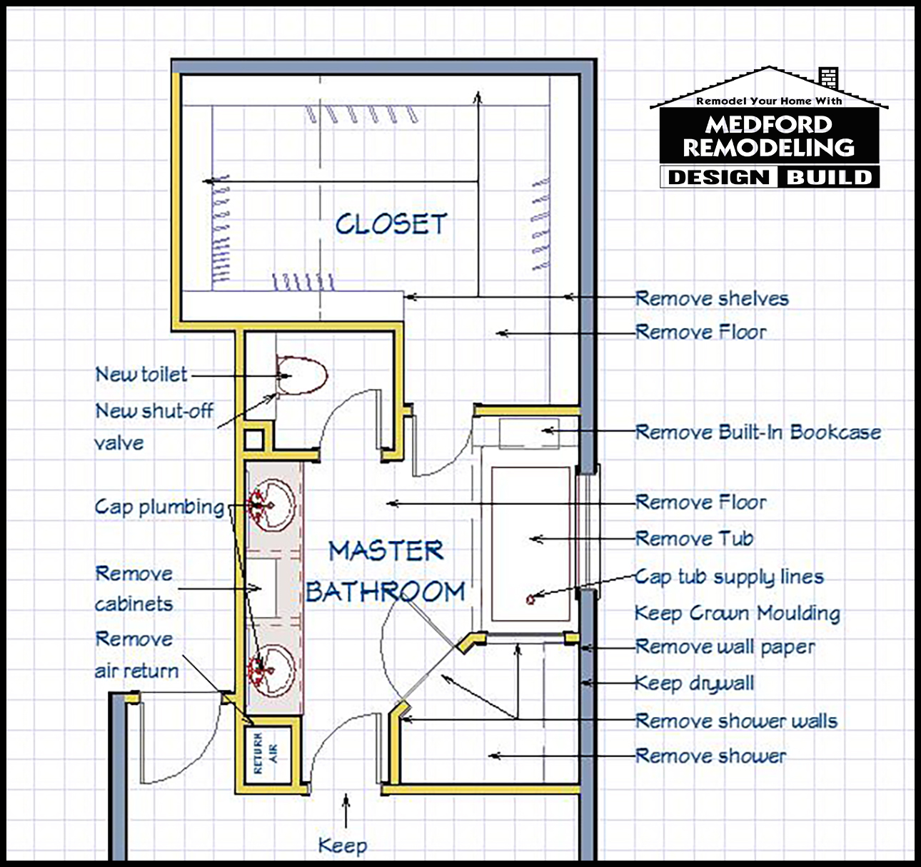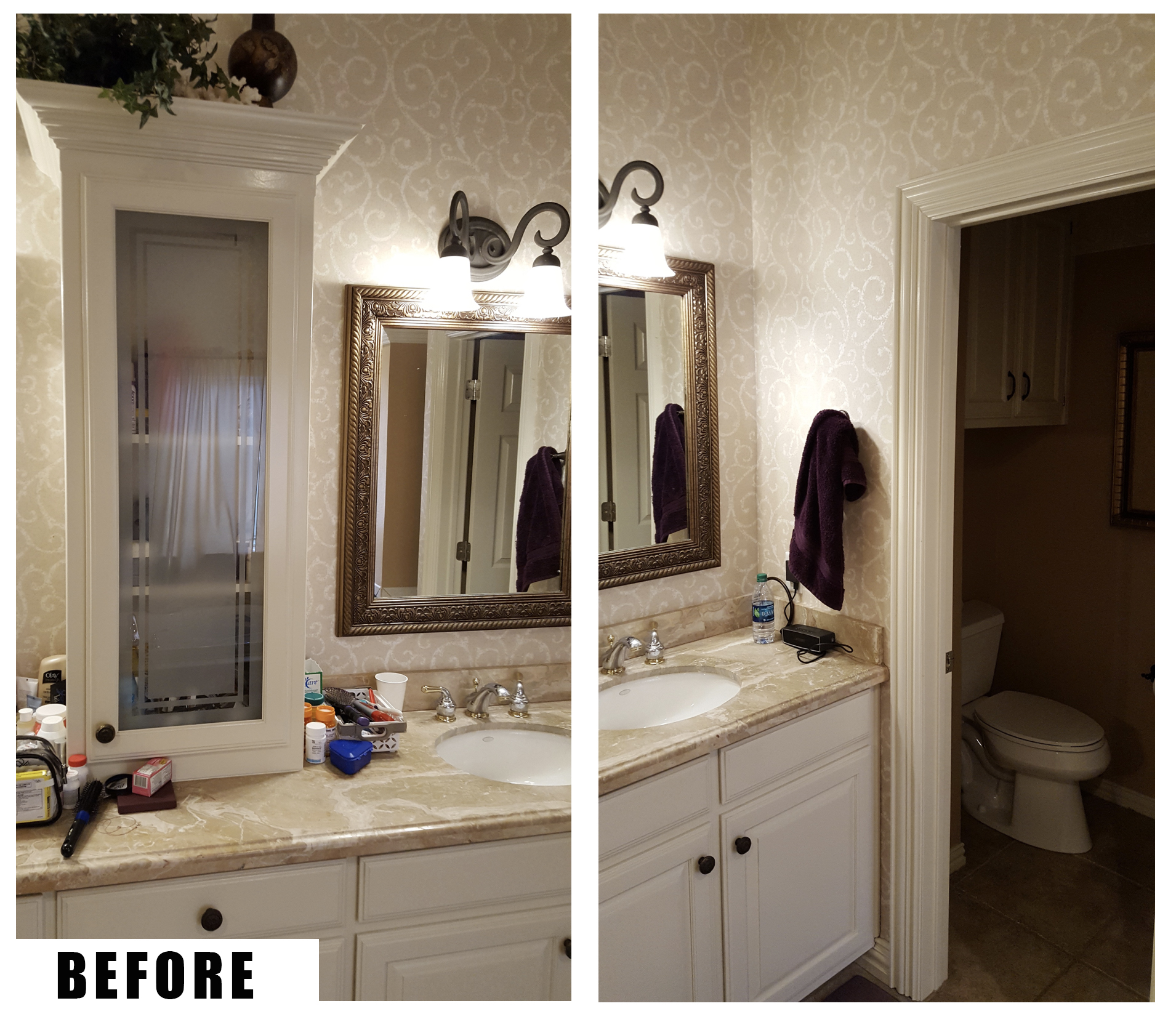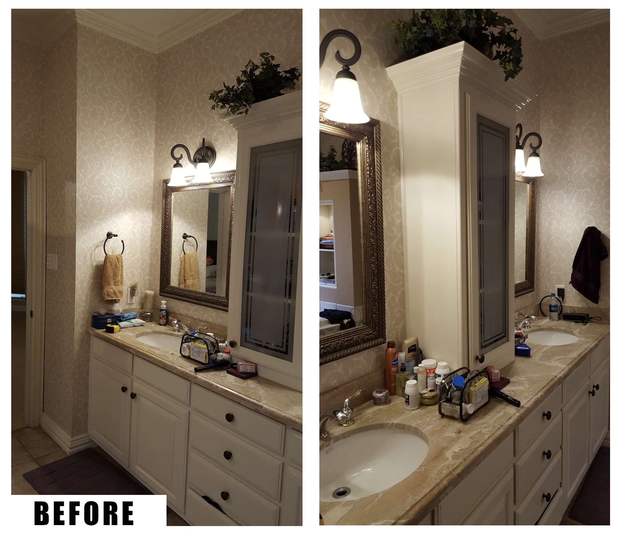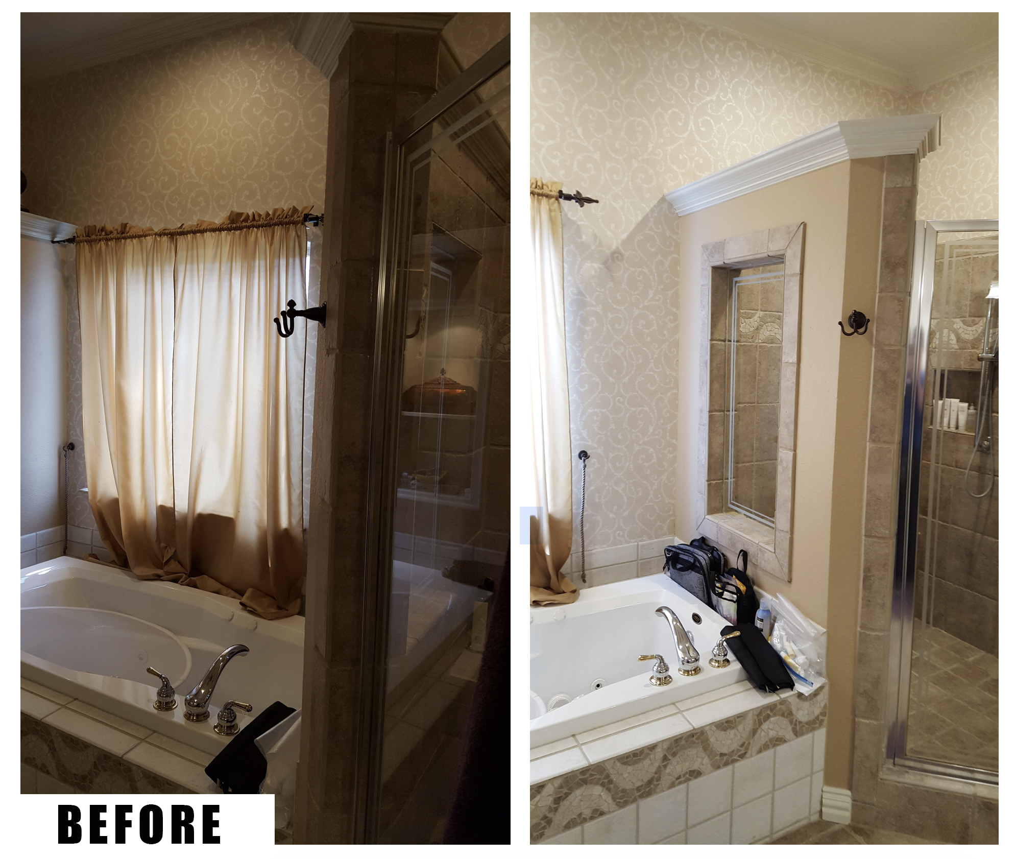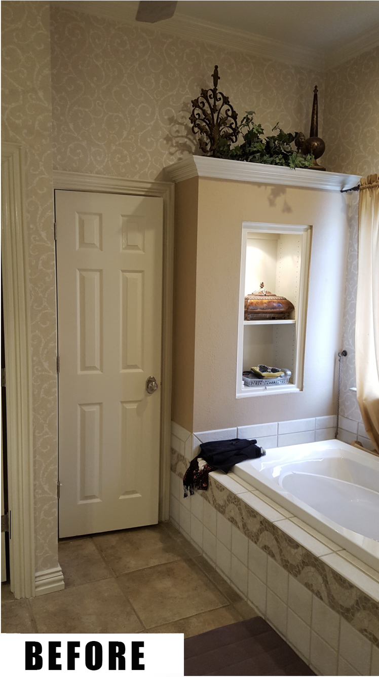 Our recent bathroom project involved renovating a large master bathroom in an upper-end Arlington, Texas home. The existing bathroom was quality and functional, but it was definitely dated with the typical brown tones, wallpaper and fixtures of the 1980’s. All of the dark, earthy colors paired with the poor lighting created a cave-like atmosphere, which made the space feel dim and smaller than it actually was. The clients wanted to brighten the room with a fresher, more modern look, updated features and specialty amenities to match the rest of their luxury home.