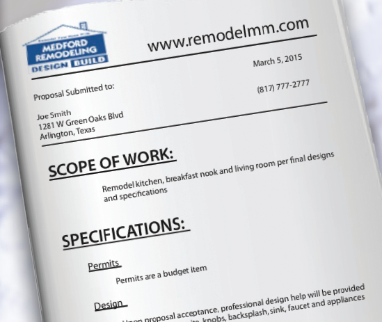 At Medford Remodeling, your custom design package includes a detailed Scope of Work document specifying exactly what is included in your project and what is not. The document also addresses a construction timeline, a payment schedule, a warranty guarantee, and a budget items worksheet.