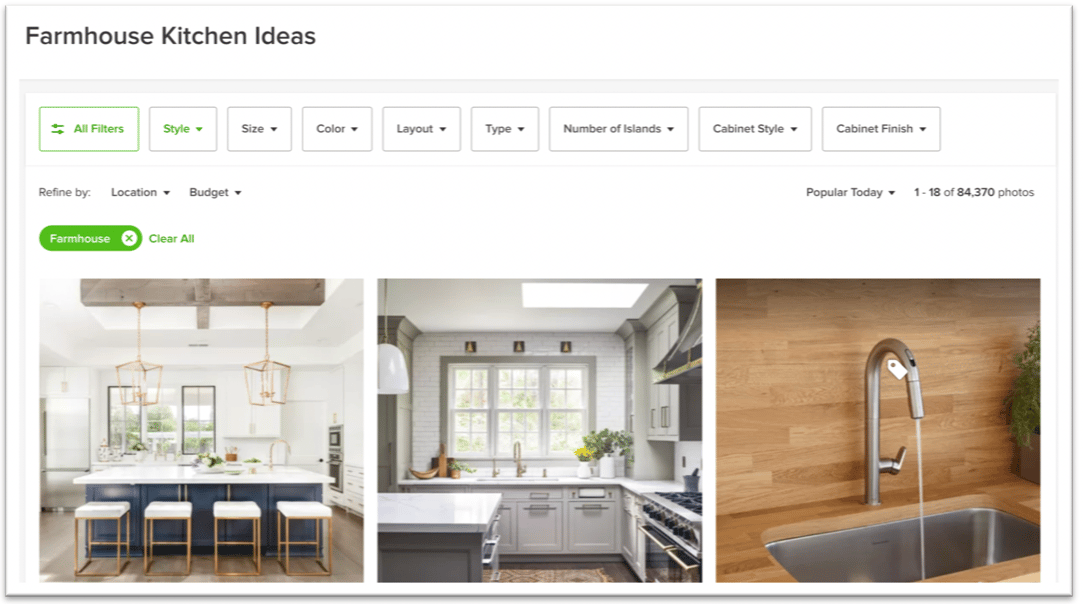 A really neat feature of Houzz is the ability to make and share “idea books.” Say you are considering a farmhouse-style kitchen or white and gray marble countertops; simply type in your search term in the search box at the top of the page and you’ll be provided with tons of photos associated with that term (notice there are over 84,000 results for ‘farmhouse kitchen’ shown above!) You are then able to save any photos that spark your interest to your idea book and include notes on what you like or don’t like in each photo. You can then to share your idea books with us directly through Houzz, so our designers can see all of the photos you’ve saved, along with your notes. This process doesn’t only serve as a valuable communication tool and time saver, but can also provide some great inspiration to you as a homeowner when you’re feeling lost about design ideas. Sometimes, a few examples are all you need to get your creativity and interest flowing (of course, our design team is here to help with input and ideas as well!)