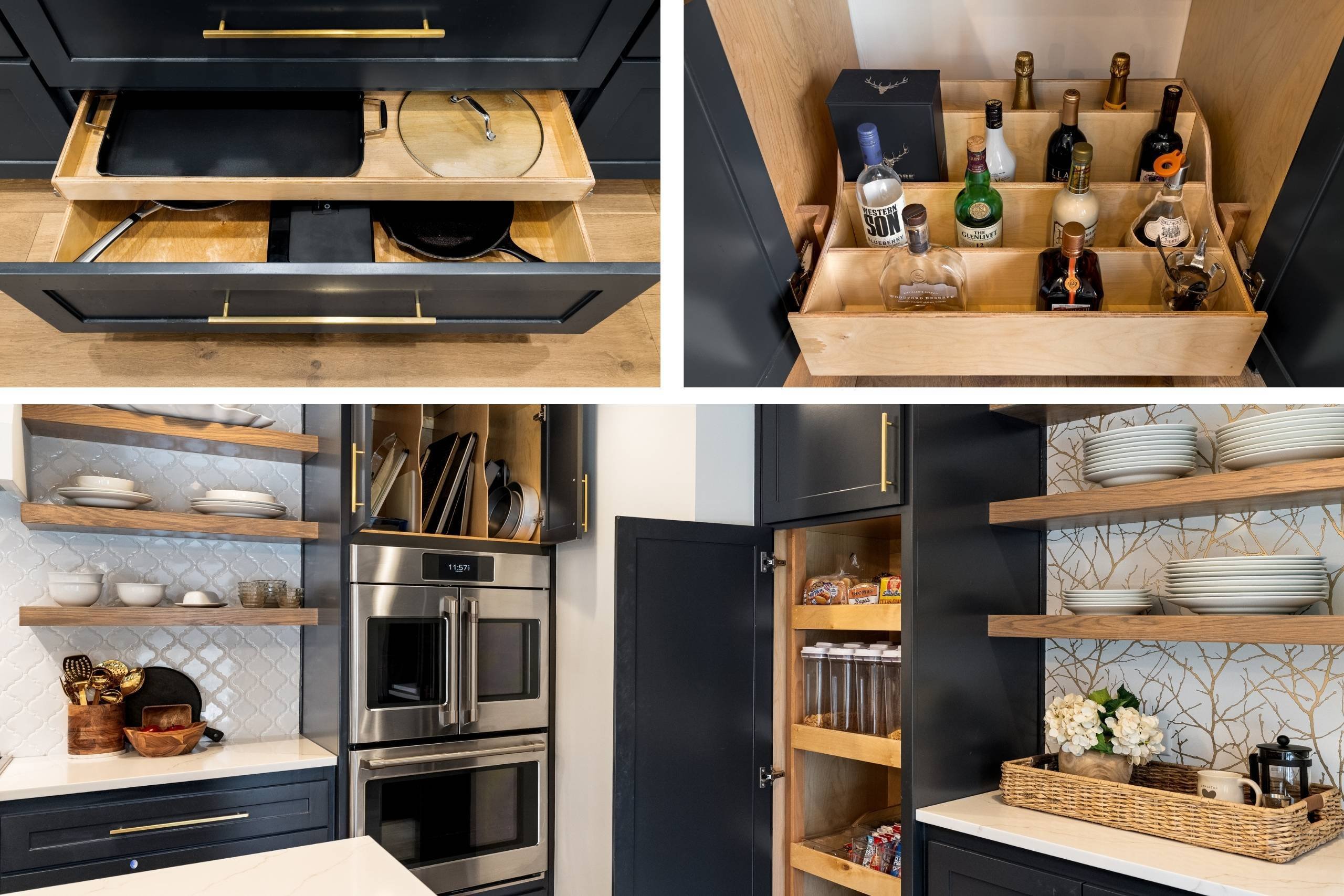 Along the secondary kitchen wall, we created a stunning focal point that’s as functional as it is beautiful. Custom-built cabinetry provides generous storage space for small appliances, serving ware, and pantry items, while open shelving above offers the perfect spot to display cookbooks, glassware, or decor. Behind the shelves, a gorgeous off-white and gold wallpaper adds a subtle touch of elegance and texture, elevating the overall aesthetic. This feature wall not only enhances storage but also brings warmth and personality to the kitchen, blending style and practicality in a truly unique way.